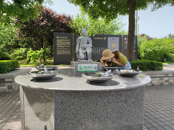 為更好地與環境相融合,此次秦始皇帝陵博物院所采用的直飲水設備皆為定制打造。多級水質處理系統融合RO反滲透分離、臭氧消毒、紫外線殺菌等先進凈水工藝,能夠充分去除水中各類有害物質,出水純凈健康。而獨具匠心的外形則采用兵馬俑造型雕刻搭配天然大理石臺體,青灰莊嚴的古典色調與恢弘壯闊的秦陵風采相得益彰,已然成為景區中一道亮麗的“綠色服務”風景線,已申報外觀設計專利,備受行業矚目。