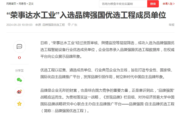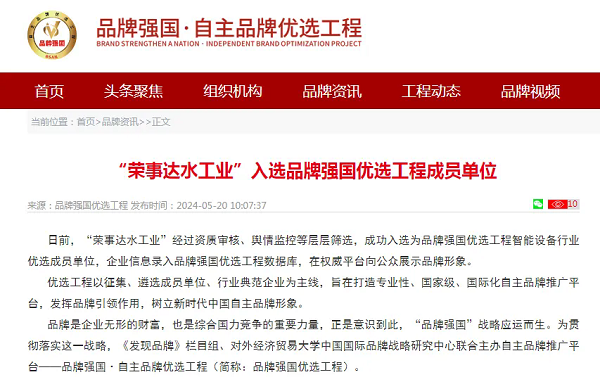 日前,“榮事達(dá)水工業(yè)”經(jīng)過資質(zhì)審核、輿情監(jiān)控等層層篩選,成功入選為品牌強(qiáng)國優(yōu)選工程智能設(shè)備行業(yè)優(yōu)選成員單位,企業(yè)信息錄入品牌強(qiáng)國優(yōu)選工程數(shù)據(jù)庫,在權(quán)威平臺(tái)向公眾展示品牌形象。