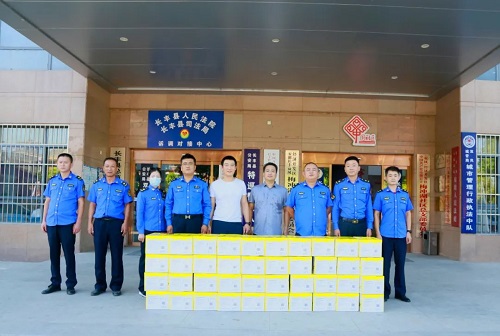 8月12日上午,榮事達水工業集團為雙鳳城市管理行政執法中隊送去一批蘇打水,向堅守在城市管理一線的工作者們表達敬意。