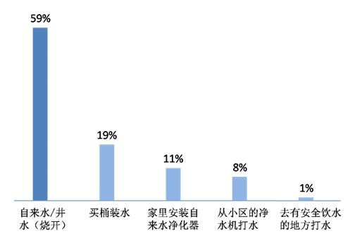 圖1. 對所住地區自來水的直觀感受另外有兩成(21%)被訪者表示“不清楚,喝不出好壞”——百姓飲用水成本越來越高,為了水杯里的安全,多數人選擇水消費:購買桶裝水、安裝自來水凈化器、從小區凈水機打水成為主流選擇,購買安全飲水正為成百姓居家繼“柴米油鹽醬醋茶”之后的“開門第八件事”。六成(59%)被訪者平時飲用水的最主要來源是“自來水/井水(燒開)”。也有不少人購買桶裝水(19%)或是從小區凈水機打水(8%)來飲用。“家里安裝自來水凈化器”的被訪者也不少,為11%。