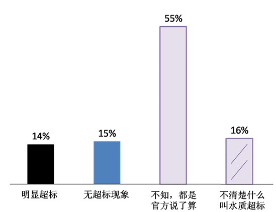 圖4. 居住在鄉村的受訪者對污染源的感受水安全信息“后知后覺”,百姓健康權利被透支本次調查的結果,體現出了水污染的嚴重程度、最主要的污染源等問題,然而比這些問題更值得關注的現象,是人們對攸關家人健康的環境信息的“后知后覺”、獲取水環境信息時的困難。據環保部今年3月14日發布的研究結果顯示,全國2.8億居民飲用水存在不安全問題。但是,當我們問到“據您所知,所住地區是否有飲用水超標現象”時,并沒能直接得到關于百姓身邊飲用水超標程度的認知結果,數據呈現的是人們對“飲用水水超標”問題的無奈。——對于“水杯里的飲水安全”,只有不到三成的被訪者給了我們“明顯超標”(14%)或“沒有超標現象”(15%)的明確答案。七成被訪者對此一片茫然:55%被訪者表示“不知道,超不超標都是官方說了算”,16%的人甚至“不清楚什么叫水質超標”。