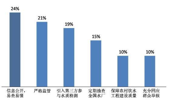 圖7. 被訪者對于水安全知識的了解情況改善“水杯民生”,當從實現公民環境知情權開始當我們問到“在水安全問題上,目前最希望政府做些什么”,不少被訪者選擇了“依法嚴格監管”(21%)、“引入第三方參與水質檢測”(19%)、“定期對全國的水廠進行抽查”(15%)和“保障農村飲水工程建設質量”(10%)。然而比起這些“管控”措施,人們最希望的是“信息公開,并使公眾易查、易懂”(24%)。這充分體現了百姓對于維護自身環境健康權益的強烈需求:公民環境權益的實現,離不開最起碼的環境知情權。一個愿意對環境安全負責任的政府,在作出公民環境參與的承諾之前,理應讓每個公民對行政機關所持有的環境信息擁有適當的獲得利用權。使水污染信息真實、透明、易查易懂,這既是本次調查中百姓對于當前政府改善環境民生的迫切期待,也是中國推進公民參與的環境法治的必經之路。